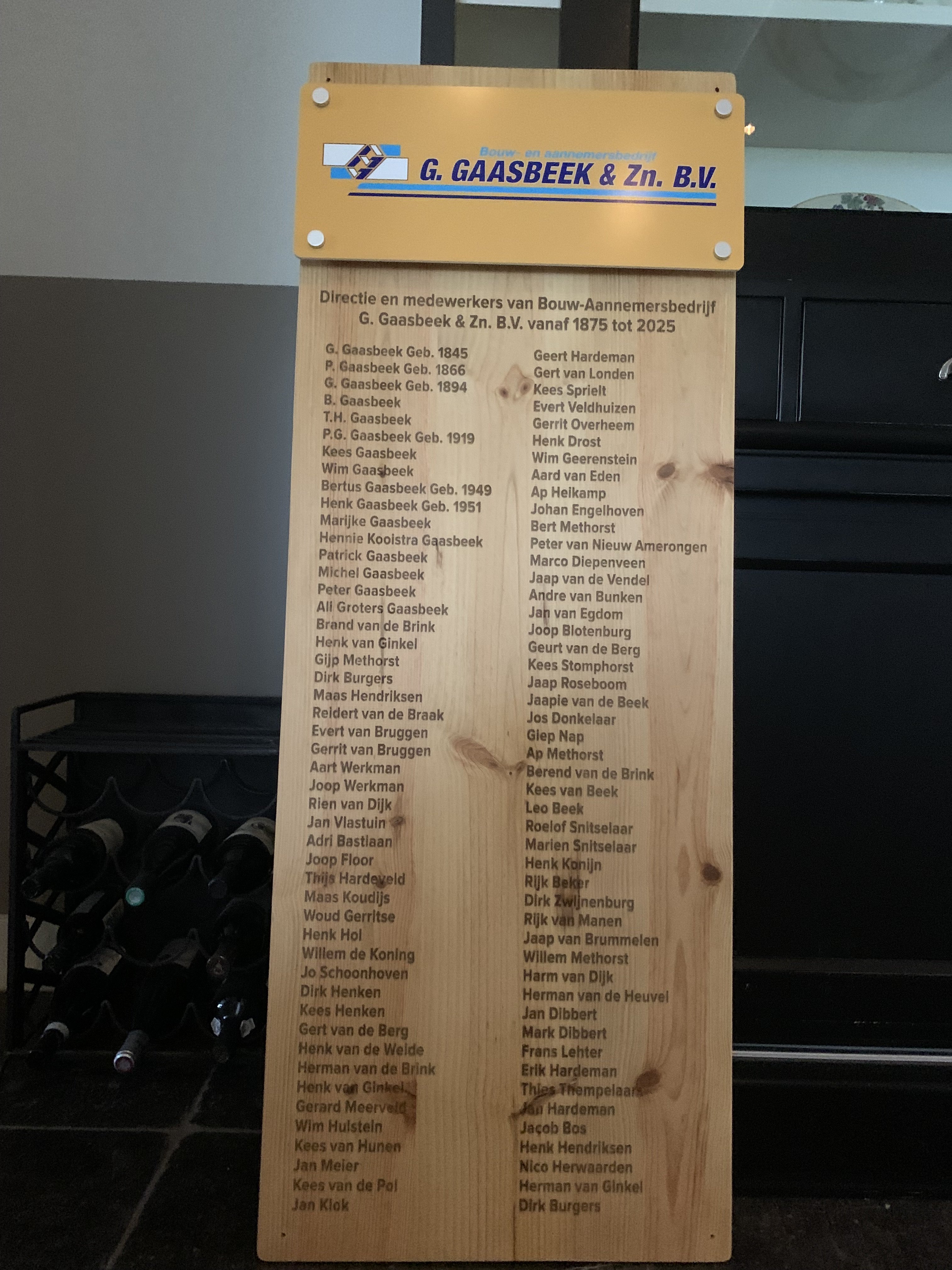 Zaterdag 8 februari werd dit jubileum gevierd. Ook werd er een bord onthuld met alle namen van personen die er in die 150 jaar werkzaam zijn geweest bij Gaasbeek.