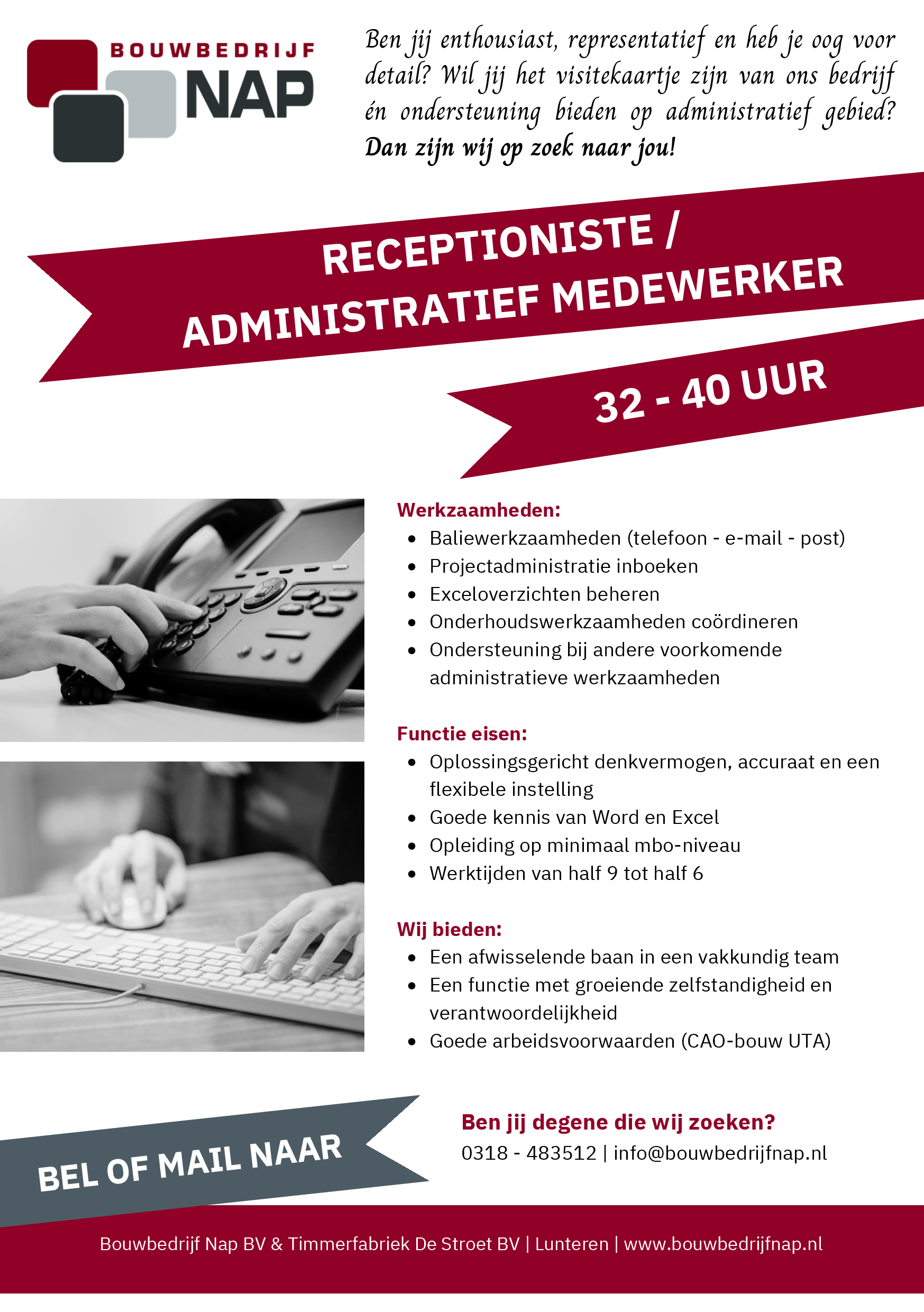Receptioniste / administratief medewerker (32 - 40 uur)
